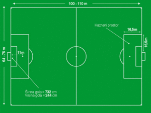 Теренот мора да има форма на правоаголник. Должината не смее да биде поголема од 120 метри ниту помала од 90 метри. Најголемата широчина на теренот е 90, а најмала 45 метри. За меѓународни натпревари теренот не смее да биде подолг од 110 метри ниту пократок од 100 метри. Широчината не смее да биде поголема од 75 метри ниту помала од 65 метри. Во секој случај должината мора да биде поголема од широчината.